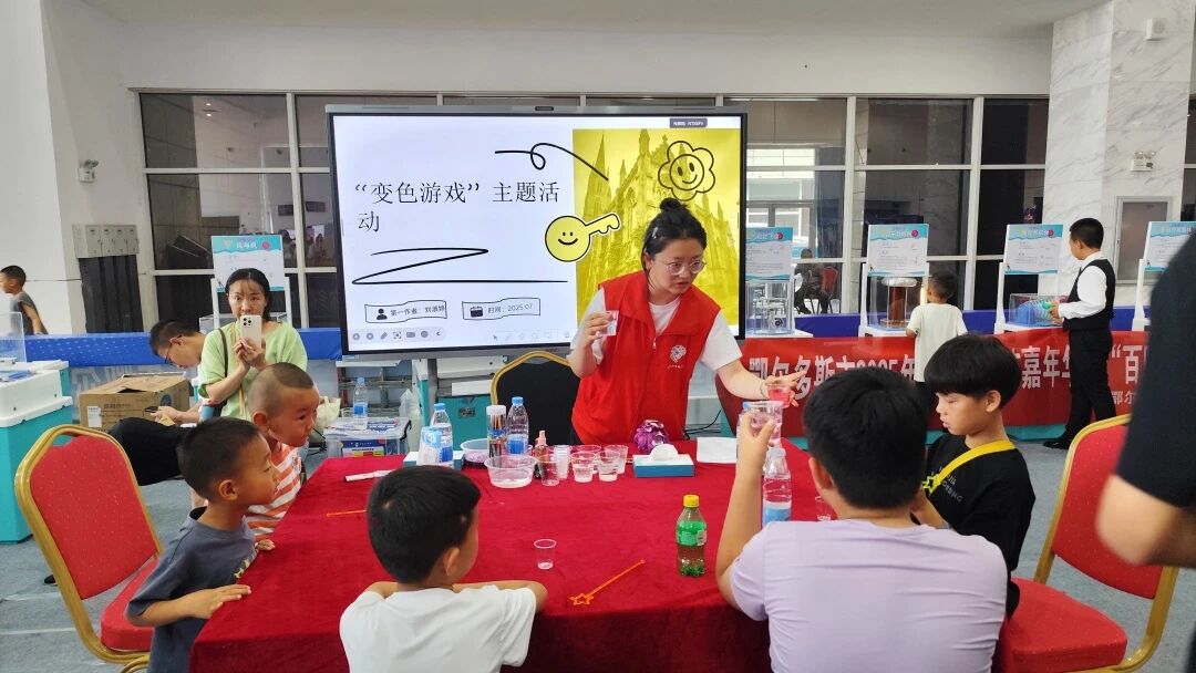 在科技嘉年华现场,科普大篷车不仅带来丰富的互动展品,还开设了特别设计的“科学课”体验环节。课程将“变色游戏”和“制作汽水”两大主题融合,通过动手实验引导学生深入理解化学原理。