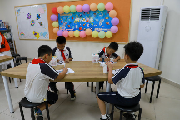 科学画未来区域,孩子们拿起画笔,描绘心中的未来科技世界,展现无限想象力。