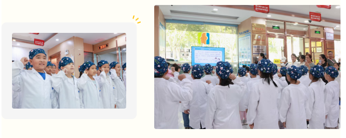 活动一开始,孩子们换上专属“小医生”工作服,戴上迷你医生帽,在工作人员的引导下整齐列队。随着一声令下,小小医生们高举右拳,庄严宣誓:“敬佑生命,患者至上……”