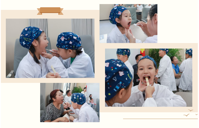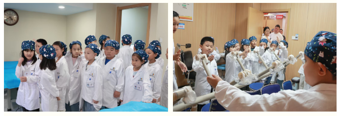 孩子们听得聚精会神,还体验了压舌板检查扁桃体的过程,模仿医生查体动作,场面活泼而专注。