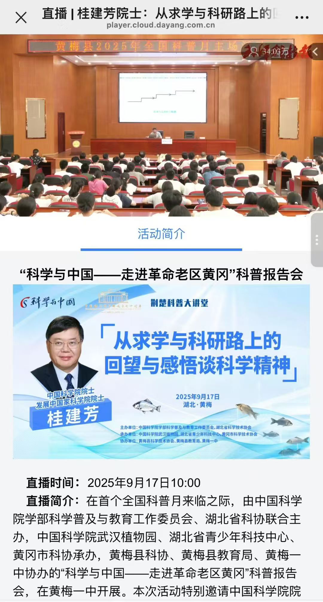 在全国科普月活动期间, 9月17日,“科学与中国——走进革命老区黄冈”科普报告会在黄冈市黄梅县举行。中国科学院院士、中国科学院水生生物研究所研究员桂建芳以《从求学与科研路上的回望与感悟谈科学精神》为题作专题报告。省科协二级巡视员陈革,中国科学院武汉植物园纪委书记贺锋,省青少年科技中心主任靖春元,中国科学院武汉植物园科普开放中心主任梅林,省科协普及部四级调研员张成,黄梅县政府党组成员、副县长张鄂等出席活动。报告会由黄冈市科协党组书记、主席彭学海主持。在活动现场,省科协为黄梅一中捐赠一批科普、科教物资。