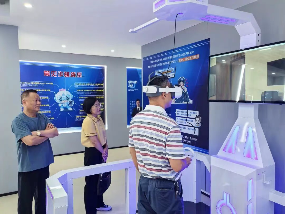 在体验馆负责人的介绍下,潘小英主席一行依次参观了“知诈、识诈、揭诈、防诈、反诈”五大篇章展区,沉浸式体验了各类创新反诈互动体验设备。在互动体验区,县科协一行戴上VR 设备,亲身体验“投资理财诈骗”等高发诈骗场景。在智能交互区,反诈机器人“小宝”互动问答,实时解析诈骗套路提示防范技巧;反诈测试抢答机前,分组竞技在测试答题中深化反诈知识记忆;反诈万花筒将复杂诈骗链路转化为可视化知识图谱,知识模块对应反诈测试,可操作性和实用性很强。