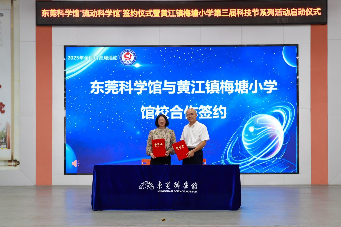 签约仪式上,东莞科学馆与黄江镇梅塘小学正式签订“馆校合作”协议,携手翻开科学教育创新发展的新篇章,致力于为学生打开科学视野,让科学魅力点亮校园生活。