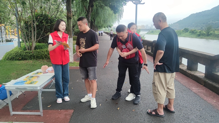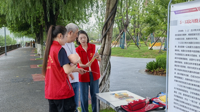 活动期间,纪念馆抗震救灾精神宣讲小分队精准选址,在梓潼县文昌镇崇文社区、翠云社区及潼江社区滨江公园等人员密集区域搭建宣传站点,以“理论讲解+现场演示”双轨模式开展科普服务,知识讲解“入脑入心”。宣讲人员围绕地震成因、预警信号识别(如预警短信、声光警报含义)、震后12秒黄金逃生法则、被困时求救技巧等核心内容,用“方言+案例”的方式拆解专业知识,避免“照本宣科”。