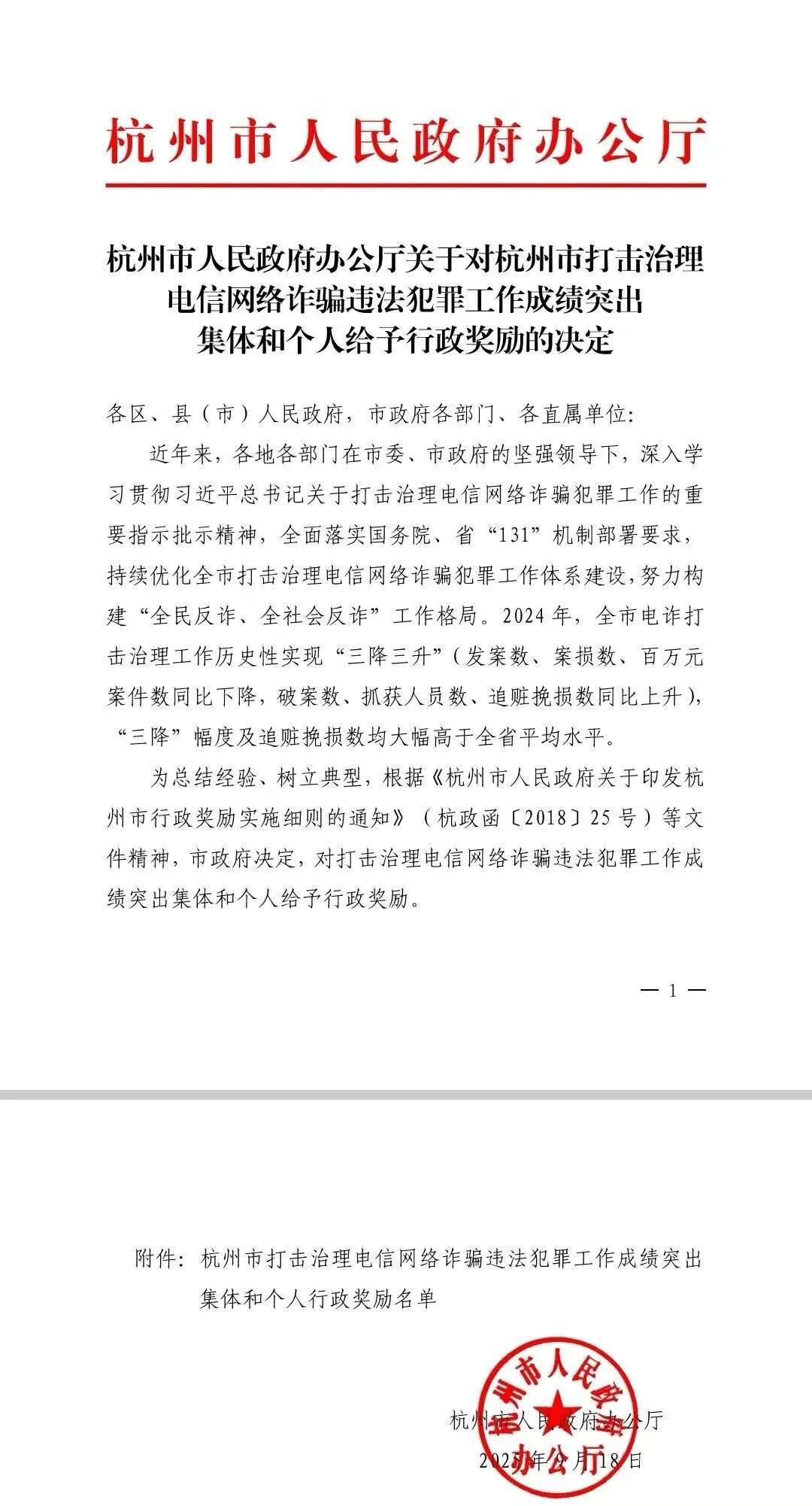 为总结经验、树立典型,根据《杭州市人民政府关于印发杭州市行政奖励实施细则的通知》(杭政函〔2018〕25号)等文件精神,市政府决定,对打击治理电信网络诈骗违法犯罪工作成绩突出集体和个人给予行政奖励。