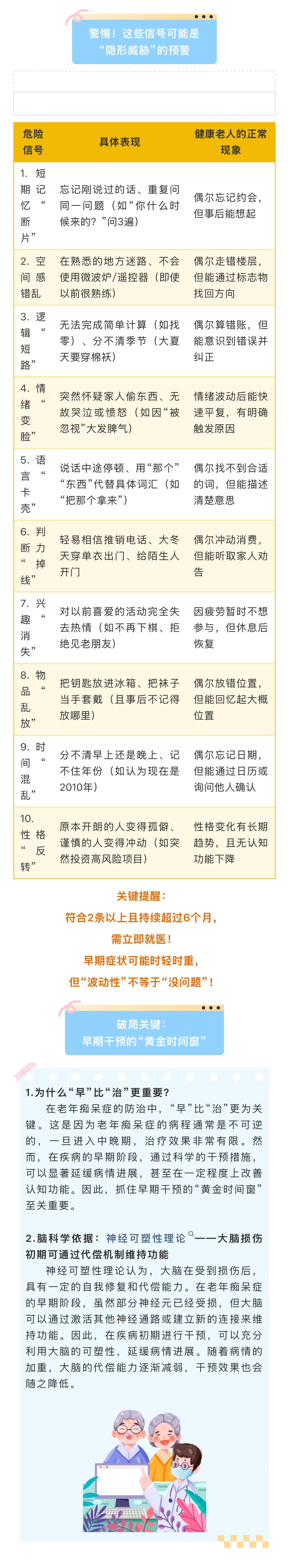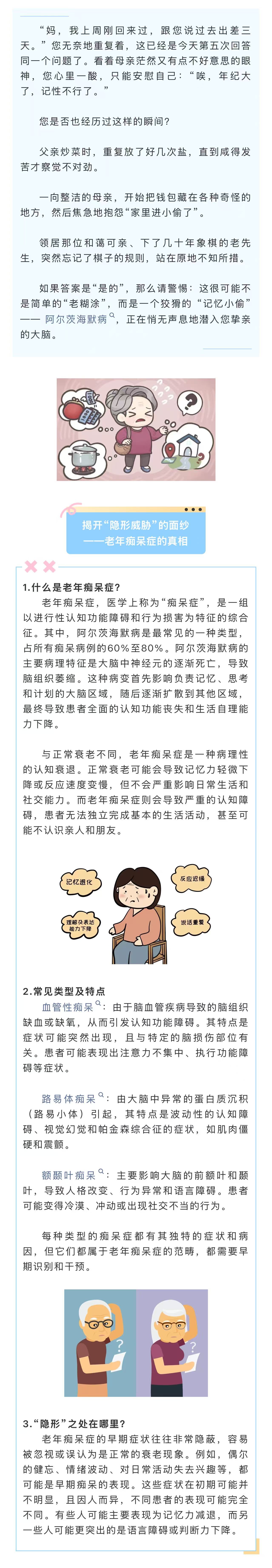 图文简介: 一个狡猾的 “记忆小偷” —— 阿尔茨海默病,正在悄无声息地潜入您挚亲的大脑。我们每个人都应该积极行动起来,关爱身边的老年人,关注他们的行为和情绪变化,及时发现潜在的问题。