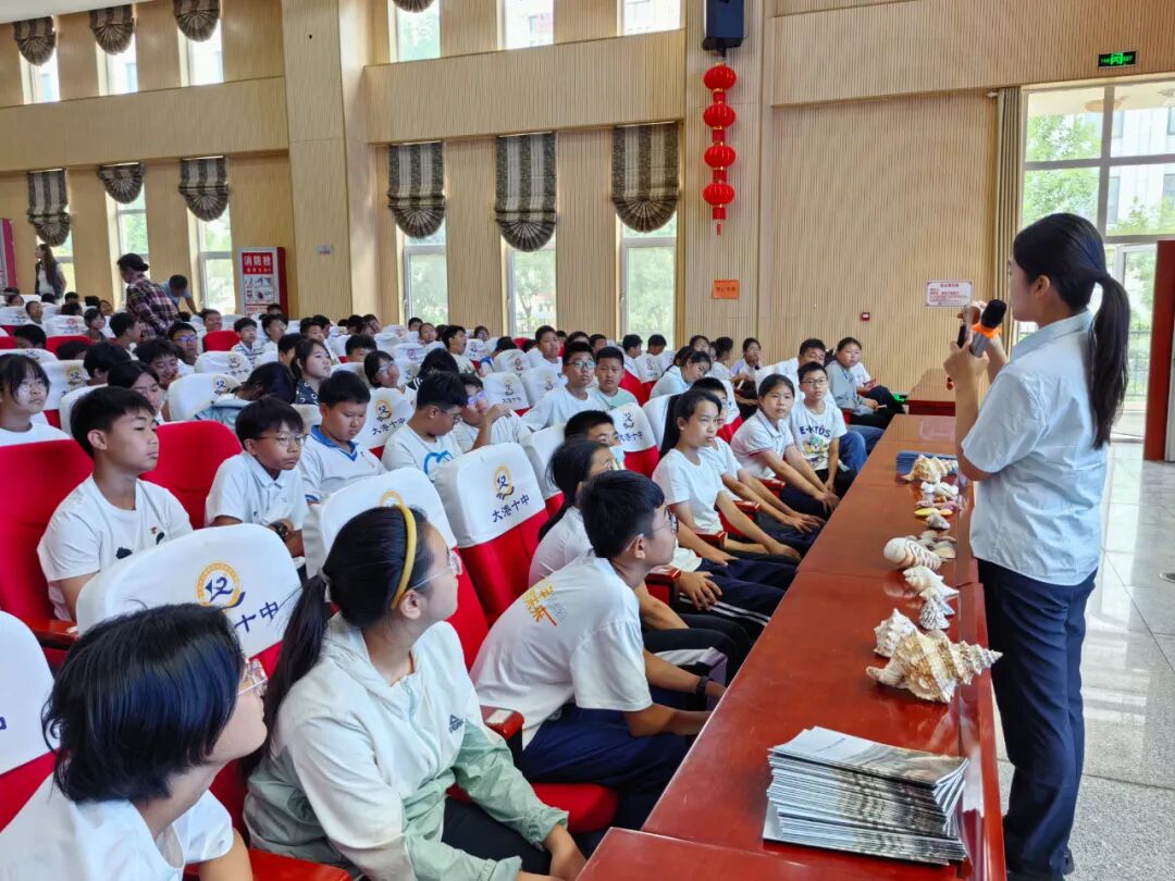 宣教老师特别将馆藏珍稀海洋生物标本“搬”进课堂,当鹦鹉螺、侏儒唐冠螺、大白蛙螺及渤海湾常见贝壳等实物标本一一呈现在眼前时,同学们瞬间被这些形态各异的海洋生物标本吸引,连连惊叹于海洋的神奇与生物的多样,课堂热情瞬间被点燃,同学们与宣教老师积极互动,活动现场气氛热烈。此外,宣教老师为同学们分发了贝壳堤科普宣传手册,使这堂课程的科普内容变得更加立体和深刻。