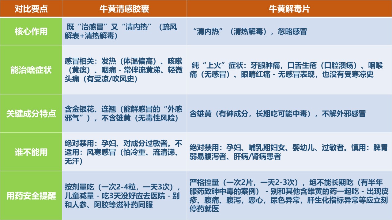 最后划重点:感冒发热咳嗽选“牛黄清感胶囊”,内热上火肿痛选“牛黄解毒片”;后者因含雄黄,务必短期、按量吃,中病即止,不确定时优先咨询医生!