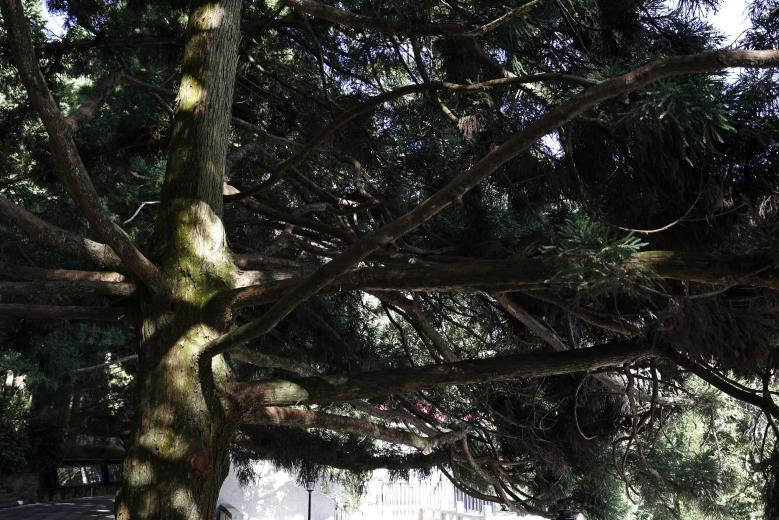 树木自有求生之道。为弥补光合作用的损失,这棵柳杉不得不萌发新枝,向四周伸展侧枝。随着周边树木不断长高,为争取阳光,它奋力抽出一条新主干,向上突围。这顽强生长的过程,恰如毛泽东《论持久战》所阐述的战略防御、相持和反攻三个阶段。