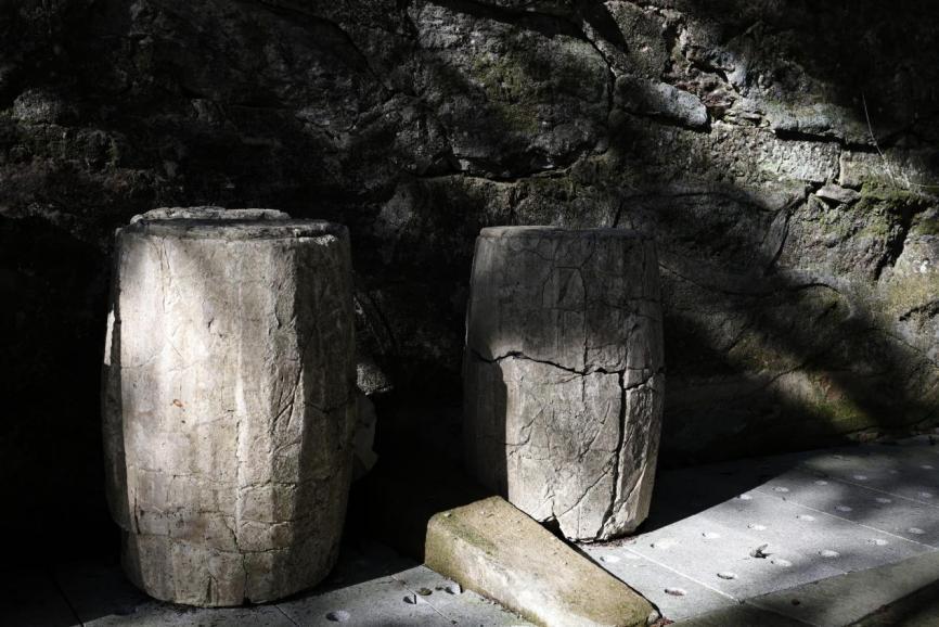 (这是从美国远道运来的桶装水泥,原本用于庐山植物园的建设。然而,尚未等到投入使用,植物园便在日军的侵略中沦陷。待到抗战胜利,工作人员从丽江复员归来时,这两桶水泥外层的木桶早已腐朽,其中的水泥也早已凝固成块。如今,它们静置于植物园一隅,作为一段无言的往事,沉默地见证着那段不容忘却的历史。)