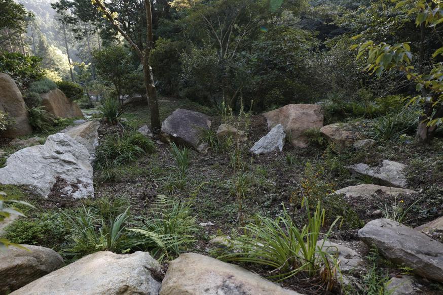 (庐山植物园内弹坑之二,后人用石头环绕,里面杂草丛生,自然的力量终将愈合土地的疮痍,但战争留下的历史伤痕,却难以抚平。)