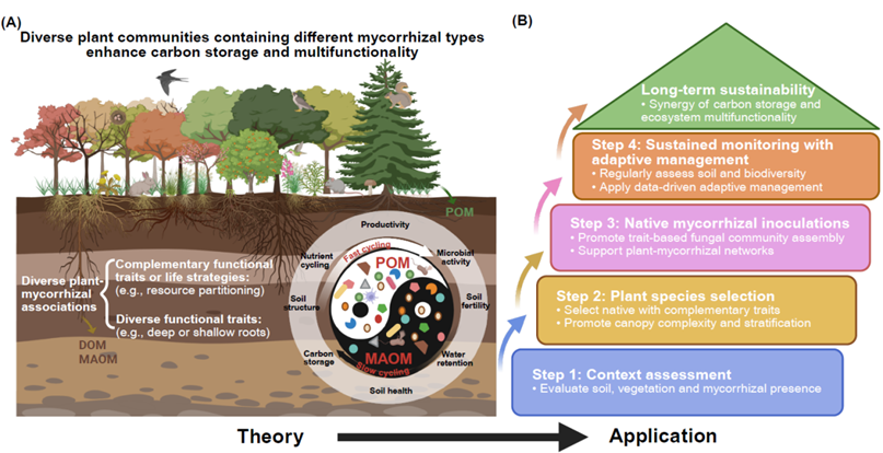 同时,我们提出的框架还为《昆明-蒙特利尔全球生物多样性框架》提供了关键的“地下解决方案”,不仅为应对气候变化和生物多样性丧失危机提供了“双赢”策略,还标志着森林恢复理念从单纯“种植树木”向科学“生态系统功能设计”的范式转变。