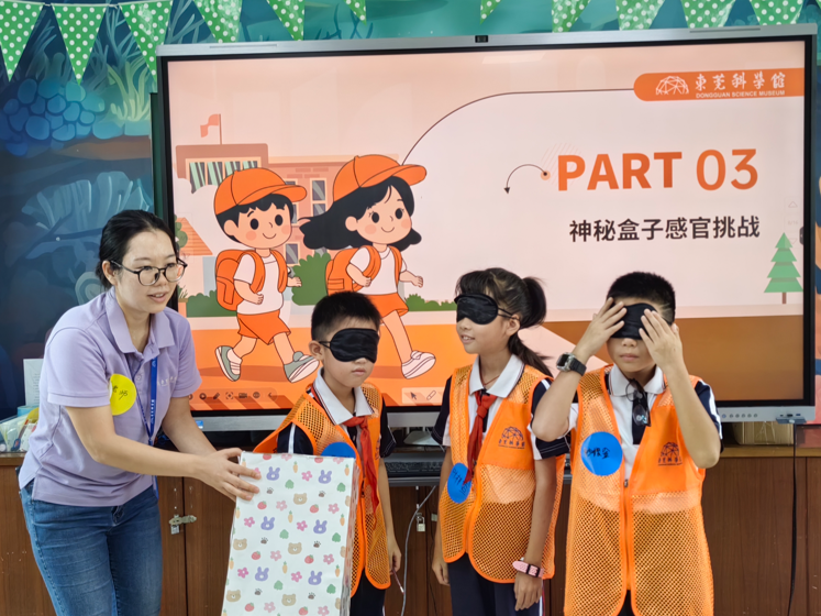 早在暑期启动前,东莞科学馆就和东莞市莞城中心小学达成共识,确定新学期大规模研学新模式——从各班挑选“小小科学辅导员”,带领组员完成研学任务。为确保“小辅导员”具备带队能力,同时探索更贴合儿童需求的研学形式,“感官小侦探系列活动”应运而生,搭起“基础体验——创新实践——方案落地”的培育链条。