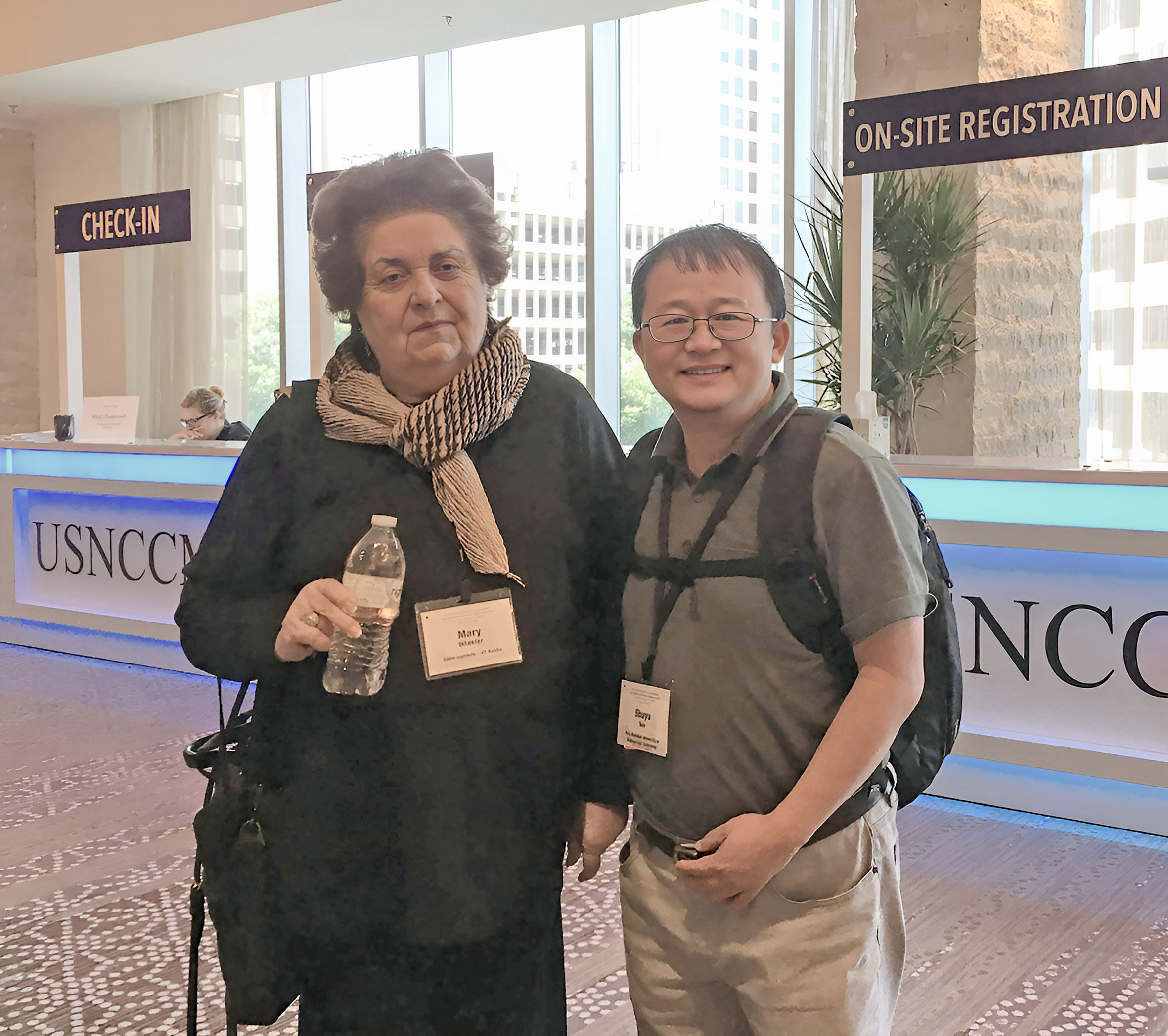 ▲孙树瑜和导师玛丽·惠勒(Mary F. Wheeler,美国工程院院士)在2019年美国计算力学大会(USNCCM)会议上见面
