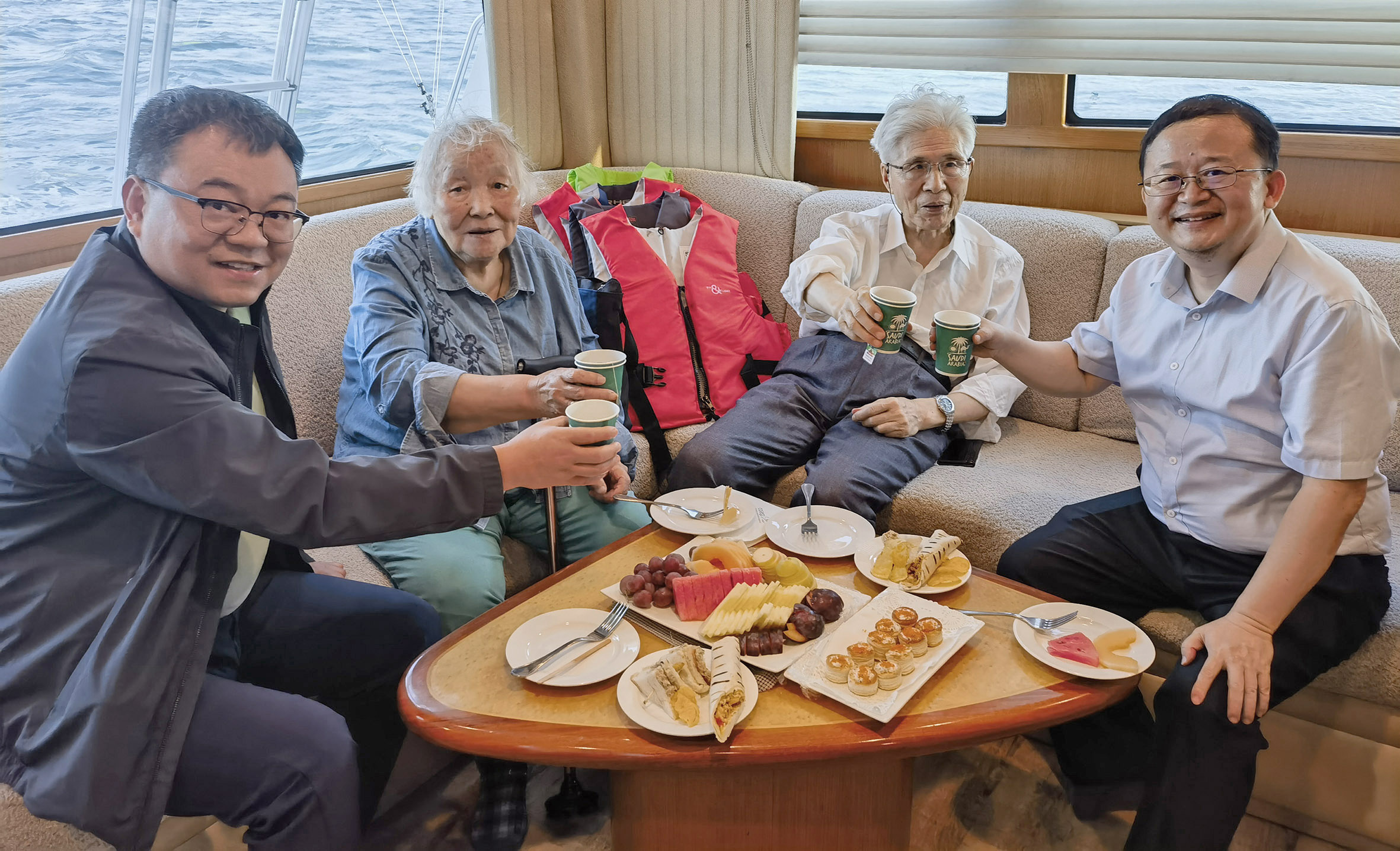 ▲从右到左: 孙树瑜、陶文铨(中国科学院院士、工程热物理学家)、陶文铨太太和乔中华(香港理工大学讲席教授)在阿卜杜拉国王科技大学的红海科考船上