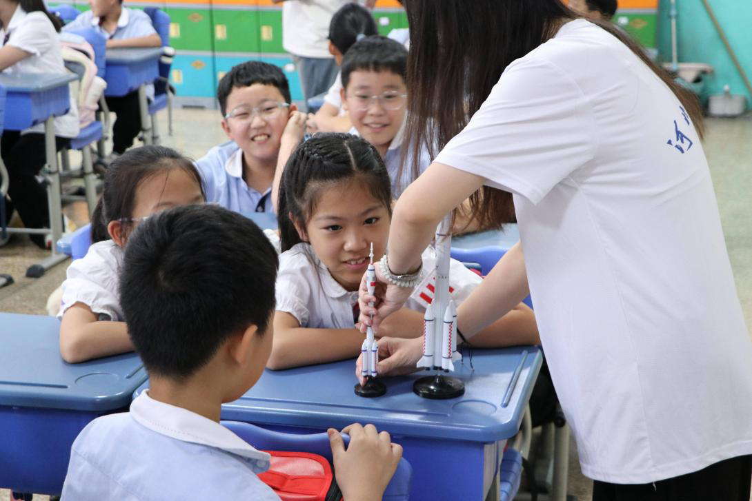 活动伊始,宣讲团成员向大家讲述了钱学森“航空救国”的爱国精神与归国奋斗历程,分享了他带领团队用算盘实现“两弹一星”的开拓创新故事。在极其艰苦的条件下,他依然带领科研人员创造出一个又一个举世瞩目的成就,为我国国防和航天事业奠定了坚实基础,同学们听得惊叹不已。宣讲团成员指出,当个人理想与国家命运紧密相连,以赤子之心为动力、以科技创新为路径,即便身处困境,也能突破封锁、创造奇迹,铸就民族脊梁。钱学森的故事令大家肃然起敬,五年级的马子涵同学表示:“钱学森爷爷的故事让我明白,科学不仅能改变世界,更能守护祖国!”