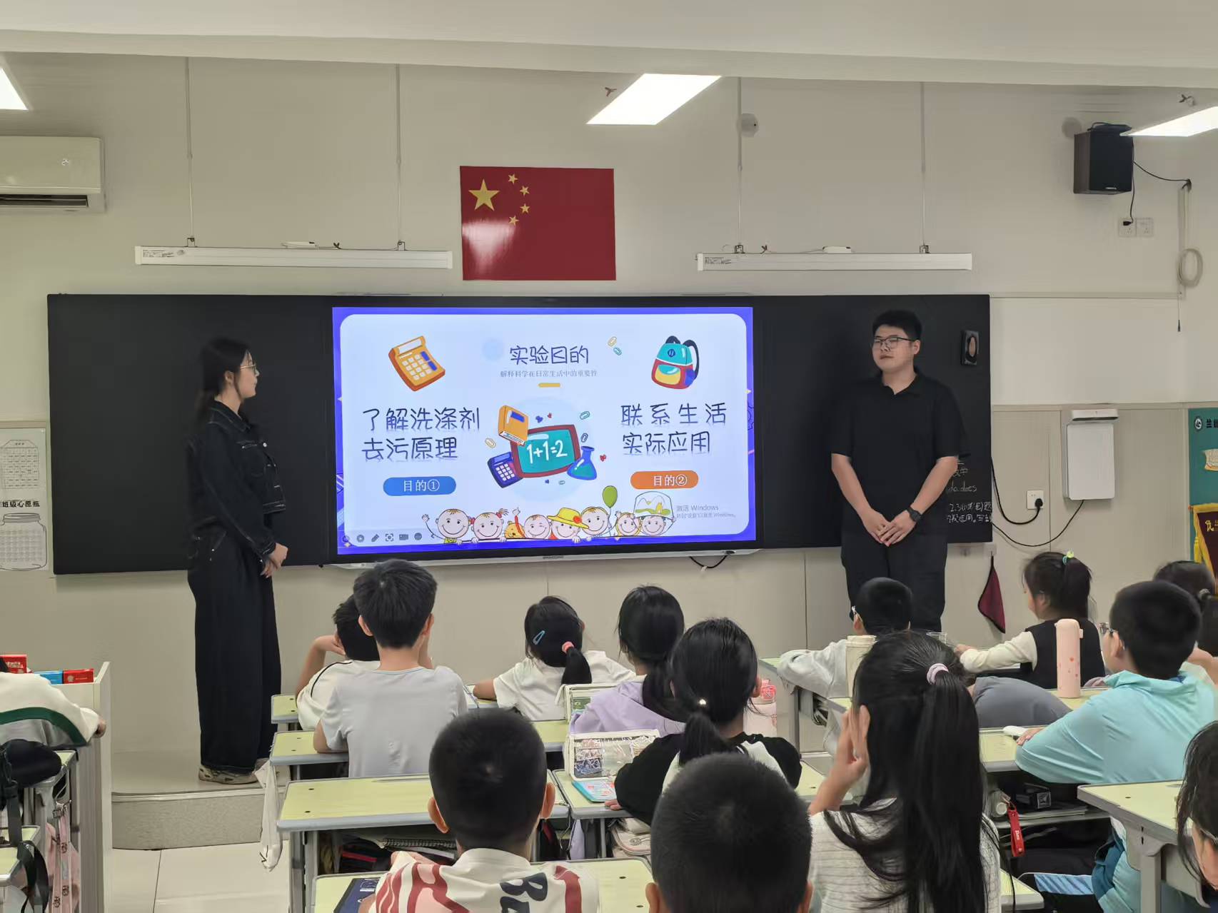 在主题课堂上,青芒科普队以“洗洁精除油污”为切入点,围绕“水油不相融”“洗涤剂分子双重特性”等核心知识点展开讲解。“油和水就像互不相识的小伙伴,而洗涤剂分子是‘和平使者’——一端亲近水,一端拥抱油,让油污乖乖溶解!”队员们用生动比喻和可视化实验,引导孩子们观察油滴在洗涤剂作用下的分解过程,直观理解表面活性剂的“亲油亲水”原理。互动环节中,“为什么洗涤剂能洗干净盘子?”“还有哪些东西含有表面活性剂?”等问题接连涌现,队员们耐心解答并鼓励学生举例生活中的科学现象,现场气氛热烈。