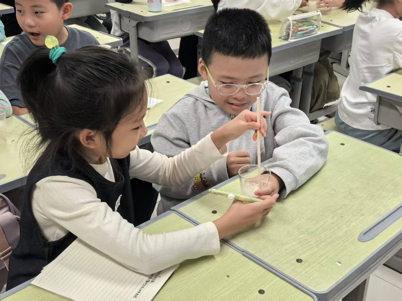 实验操作环节,孩子们分组动手调配溶液、观察乳化现象,稚嫩的脸上洋溢着专注与兴奋。四年级学生张晓萌在活动结束后说:“原来妈妈洗碗时的泡沫里藏着这么多学问!科学真有趣,我以后要当小小科学家!”