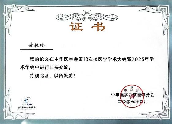 主治医师石雪、化学师国微的科普作品在全国113份智慧结晶突出重围,两位老师的科普作品践行“健康中国”战略,聚焦“短时长、强传播、深触达”核心理念,鼓励用最短时间传递核心价值,让专业知识“看得见、传得开、用得着”。 体外分析组技师黄桂玲“血碘与甲状腺功能相关性研究”参于口头交流,核医学科与甲状腺研究关系紧密,无论是在甲状腺疾病的基础研究,还是临床诊断、治疗等方面都发挥着重要作用。主治医师孔维健研究内容评选为论文壁报交流。除此之外,吉大二院核医学科10余篇成果入选论文汇编刊登交流。