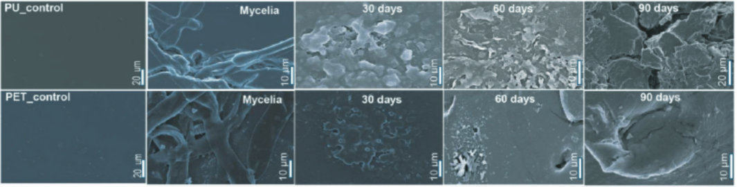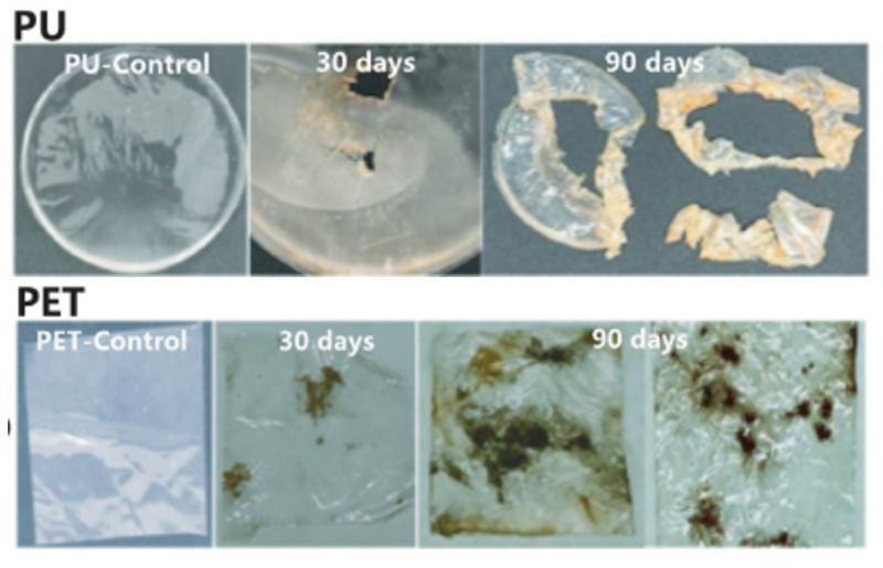 F.vanettenii真菌作用90天发生生物降解的PU薄膜和PET薄膜