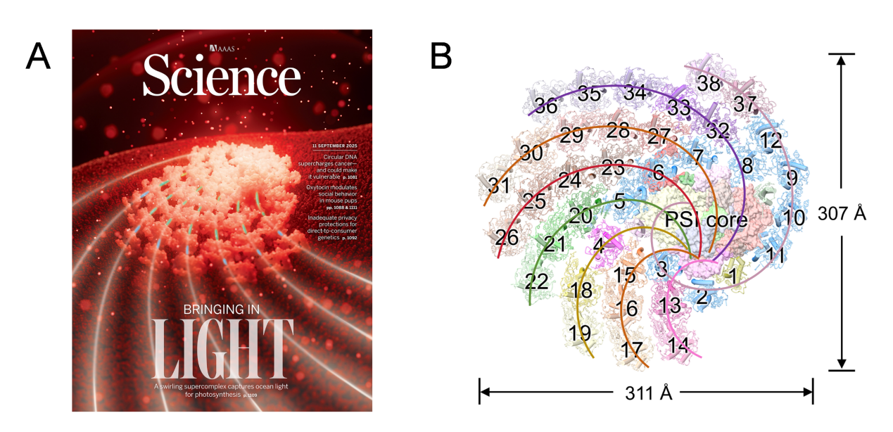 [1] Lili Shen et al. Structure and function of a huge photosystem I–fucoxanthin chlorophyll supercomplex from a coccolithophore. Science 389, eadv2132(2025). DOI:10.1126/science.adv2132