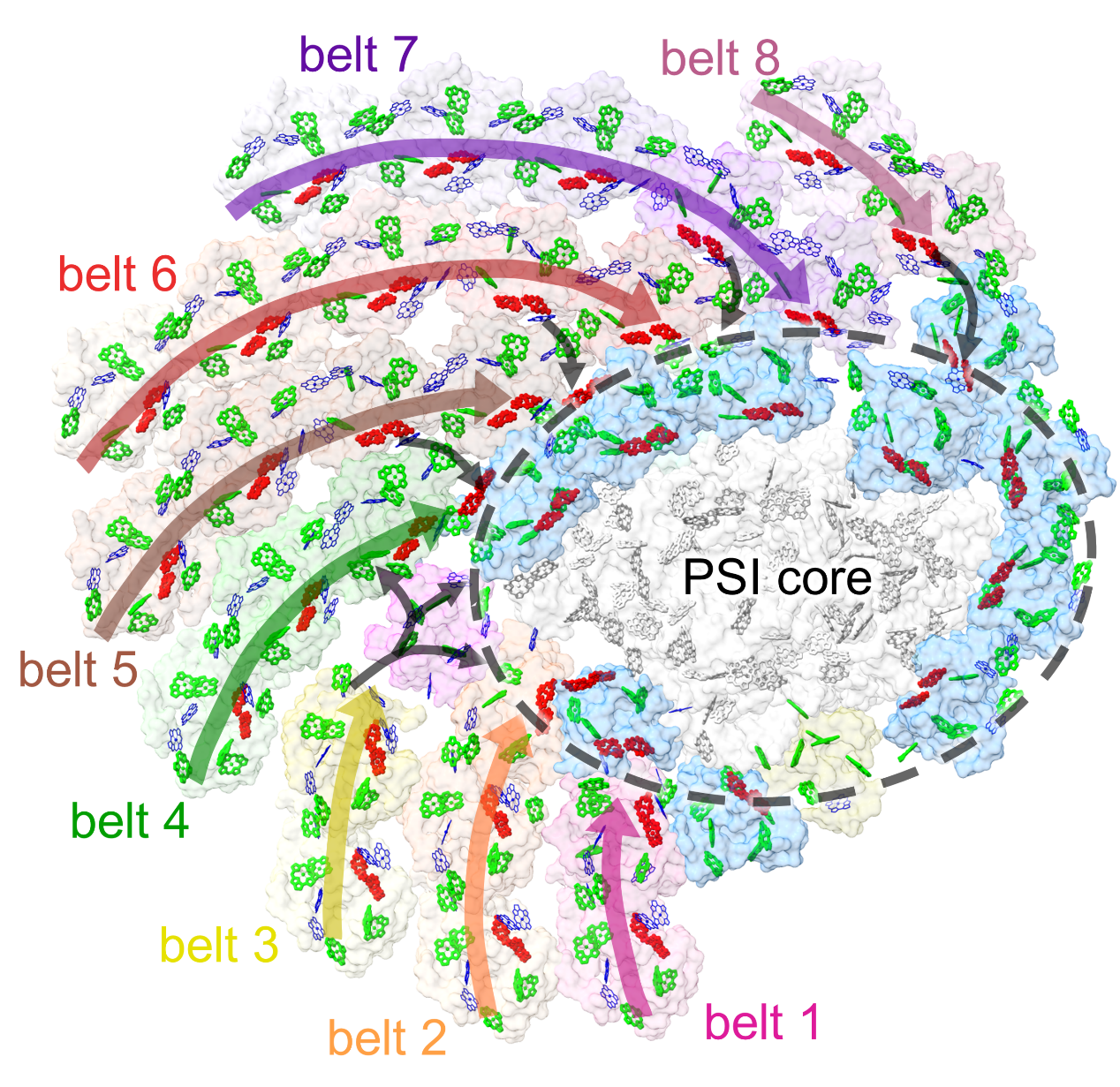 颗石藻PSI外的捕光天线条带,箭头标示出了主要的能量传递途径