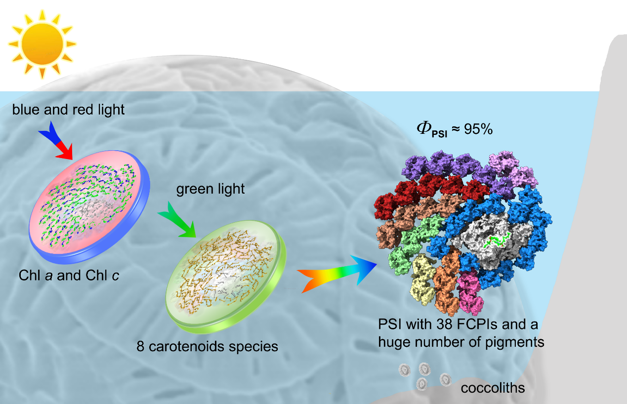 颗石藻利用PSI周围斐波那契式几何排列的带状天线和不同类型的色素分子共同协作,使其PSI转化太阳能的效率高达95%