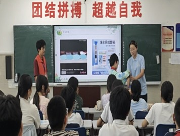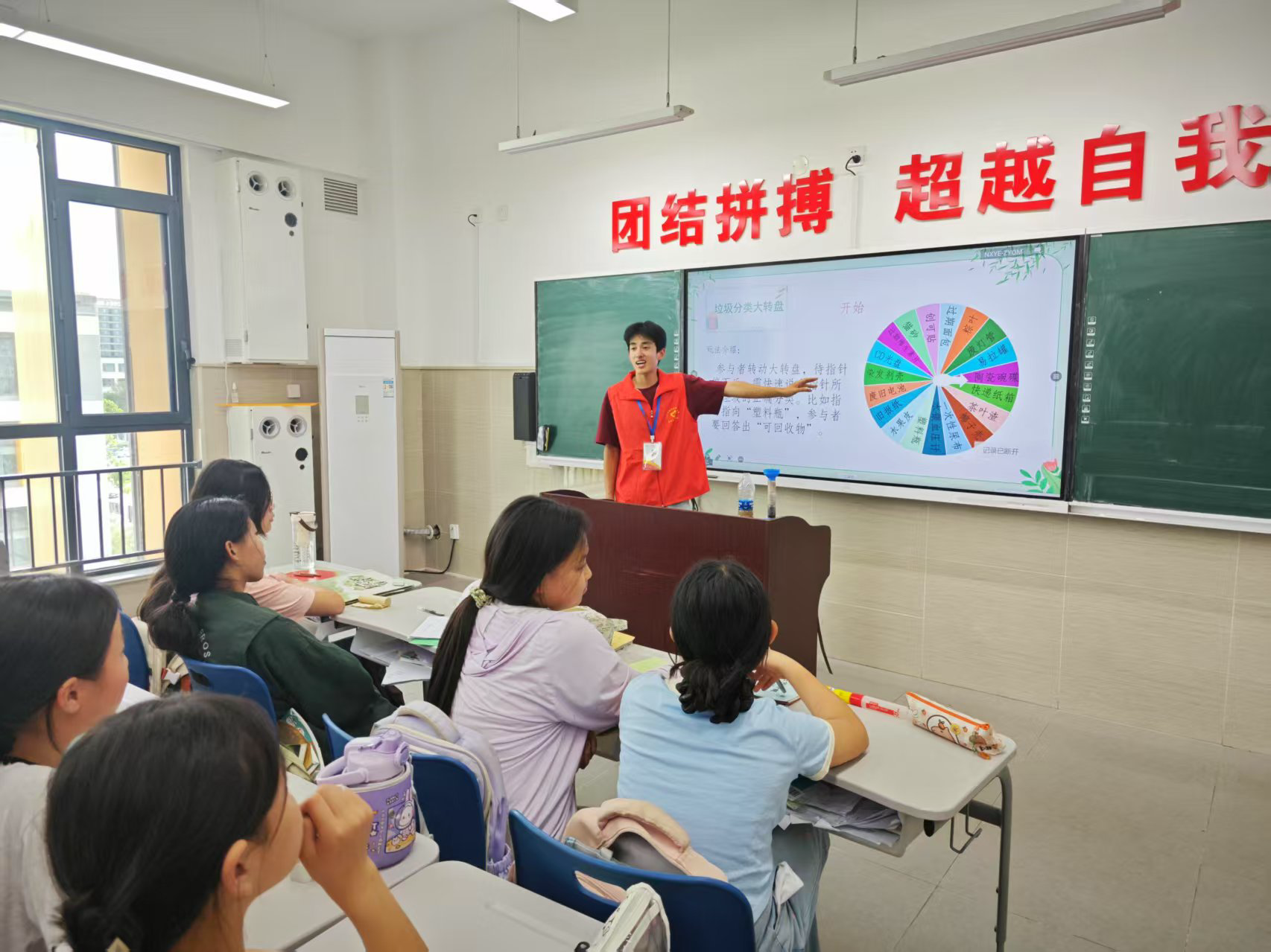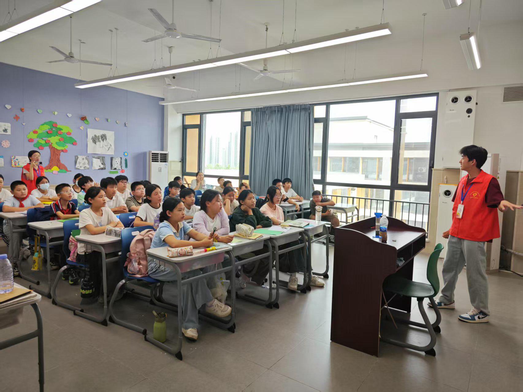 志愿者以“你知道每天产生多少垃圾吗?”为题引入主题,通过播放海洋污染短视频吸引学生关注,并结合PPT讲解垃圾分类标准。现场设置的“垃圾分类大转盘”游戏深受欢迎,学生在轻松互动中准确掌握分类知识。随后的“污水净化小卫士”实验环节,志愿者带领大家利用试管、花岗岩、活性炭等材料动手制作滤水装置,观察浑浊水质逐渐变清的过程,直观感受科技对环保的作用,并进一步引申讲解水资源保护的重要性,启发学生思考科技如何助力绿色发展。