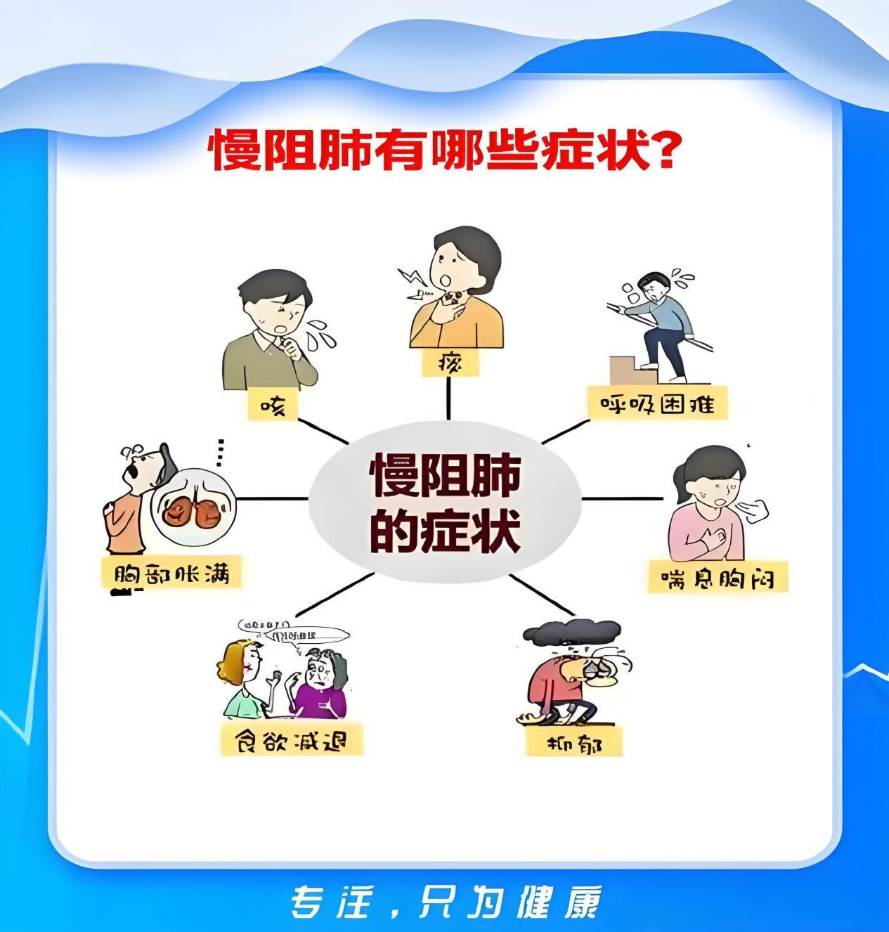 慢阻肺是一种可防治的临床常见病,主要表现为持续性通气障碍,其发病机制尚不明确。当患者表现出明显的咳嗽、咳痰、气短、呼吸困难等症状的时候,病情往往已经进入中晚期,治疗起来就比较困难。