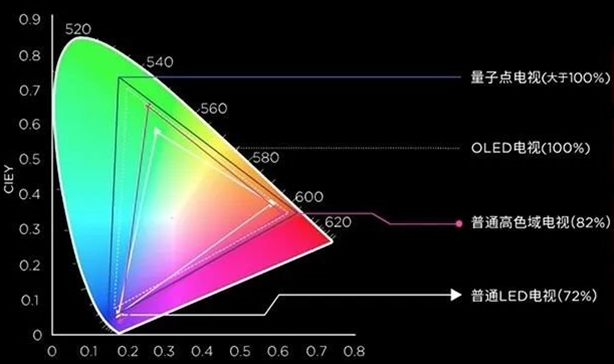因为量子限域效应已经把这些材料的光谱限制在了很小的范围内,自然,它们所转化出的红光绿光,也比传统的液晶显示屏要更纯净。有了这样纯净的显色单元,量子点显示器能提供的色彩表现力自然就能更高。人们用“色域”来描述一个显示器所能表现出的色彩范围,在市面上所有的显示器中,量子点显示器就是色域最宽的一个。