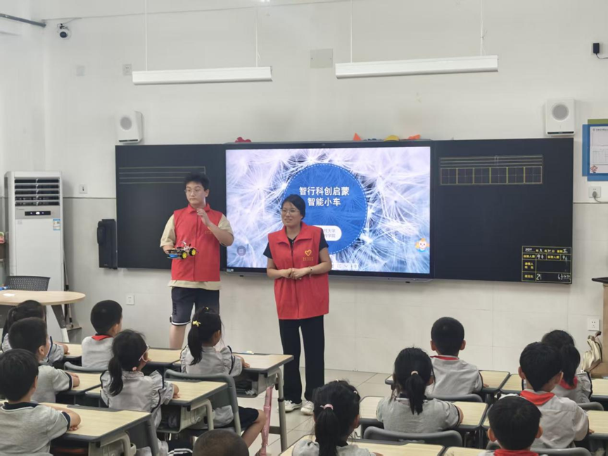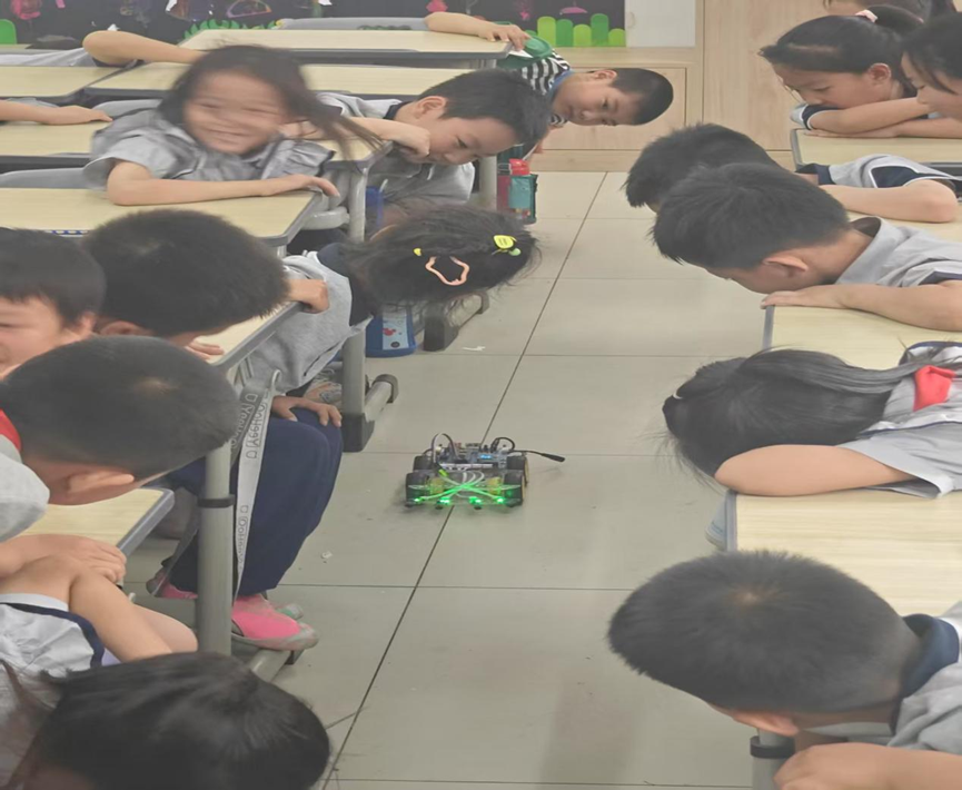 活动伊始,校机器人队志愿者用研究成果——智能避障小车点燃孩子们的兴趣,志愿团成员精心制作图文动画PPT,用深入浅出的语言向孩子们讲解智能小车的工作原理——从传感器如何“识别”路障,到芯片如何“指挥”车身行动,原本抽象的科技知识在生动比喻中变得通俗易懂。课堂上,孩子们瞪着亮晶晶的眼睛专注聆听,不时举起小手抛出“小车怎么知道前面有东西呀”“芯片是小车的大脑吗”等充满好奇的问题;当志愿团现场演示时,智能小车在地面灵活穿梭,遇到障碍物瞬间停下避让,清脆的机械运作声与孩子们的惊叹声交织在一起,学生们集体低下的头、目不转睛的眼神,令科技的魅力直观呈现出来。