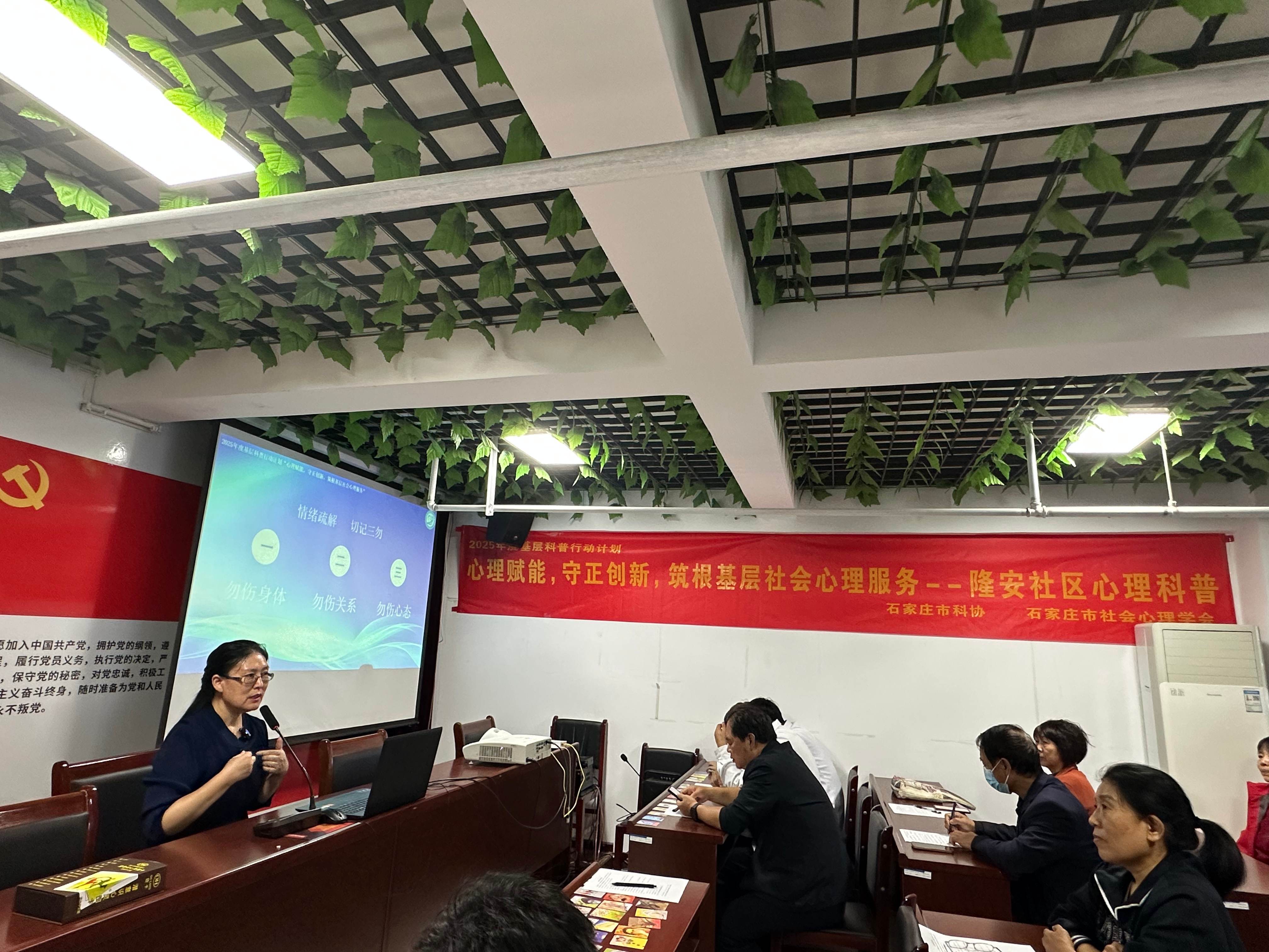为积极响应全国科普月号召,助力社区居民提升身心健康素养,9月24日,由石家庄市科学技术协会主办、石家庄市社会心理学会承办、市营养师协会协办的“全国科普月,赋能大健康”主题科普讲座在石家庄市栾城区隆安社区成功举行,该活动为“2025基层科普行动计划”的重要组成部分。活动特邀中科协心理应急服务河北省队队长、石家庄市社会心理学会副会长郝志英老师和市营养师协会马卫国会长担任讲师。本次活动采用线上+线下形式,为200余名社区居民带来了一场内容丰富、形式新颖的心理赋能、均衡食养的大健康科普盛宴。