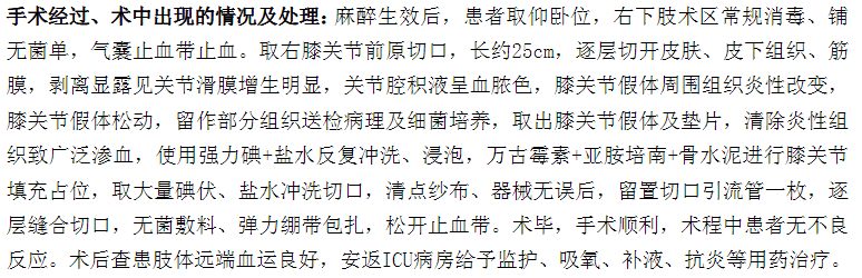 患者后续行手术治疗,术中见关节腔内脓液形成,膝关节假体松动。