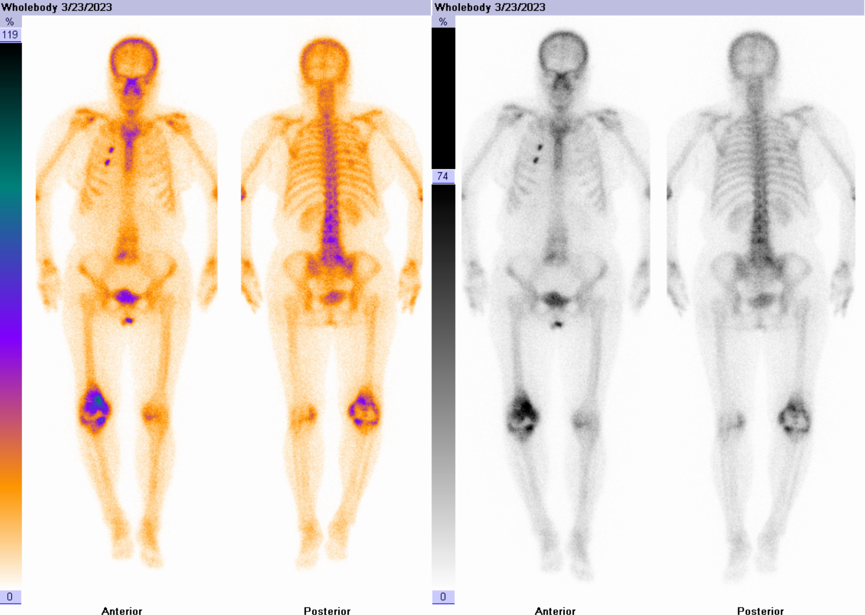 ③延迟相:反映骨代谢活跃程度,放射性增高提示骨代谢活跃,放射性减低提示骨代谢不活跃。