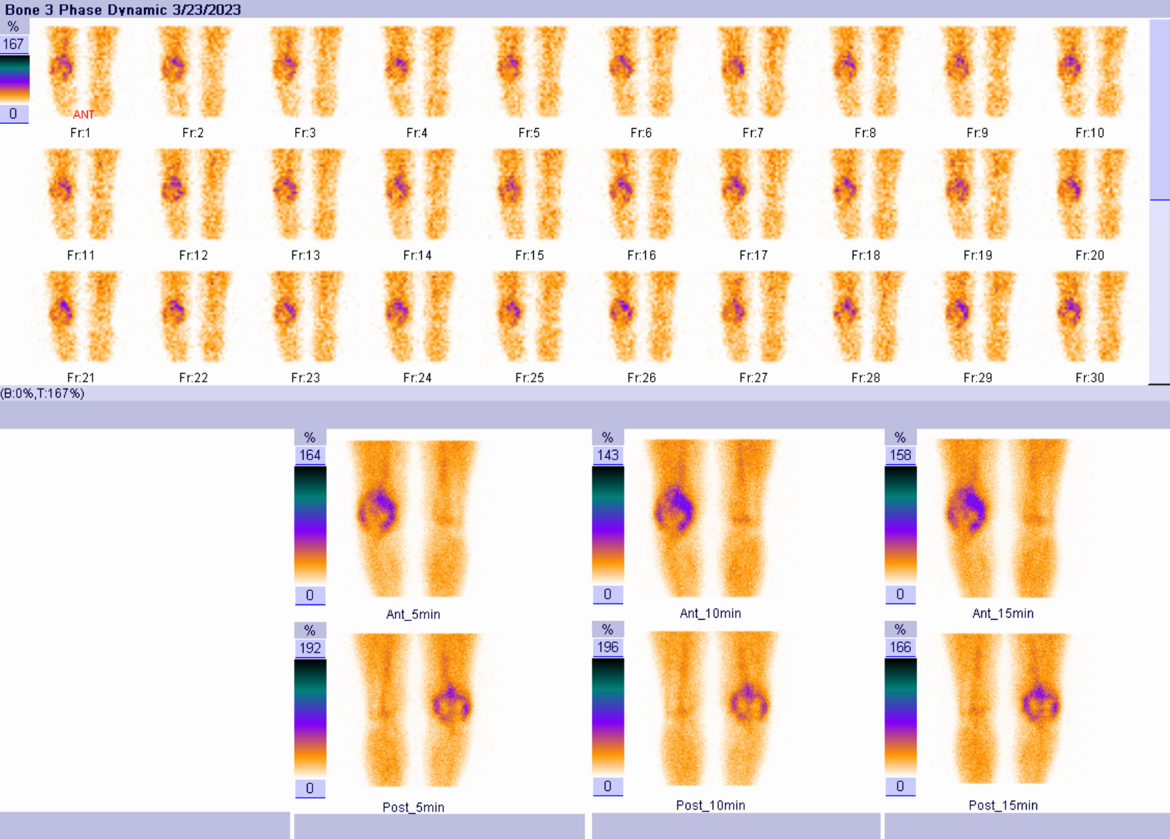 骨髓炎是一种常见的骨科感染性疾病,可导致疼痛、肿胀、发热等症状,如果不能及时准确诊断和治疗,可能会造成骨骼破坏、肢体功能障碍等严重后果,依据病程可分为急性和慢性骨髓炎,三相骨显像能在骨髓炎发病后的早期(24小时内)就显示出异常,最常见的征象是在病变部位出现血流相、血池相及延迟相局限性的放射性示踪剂异常浓聚的“热区”。