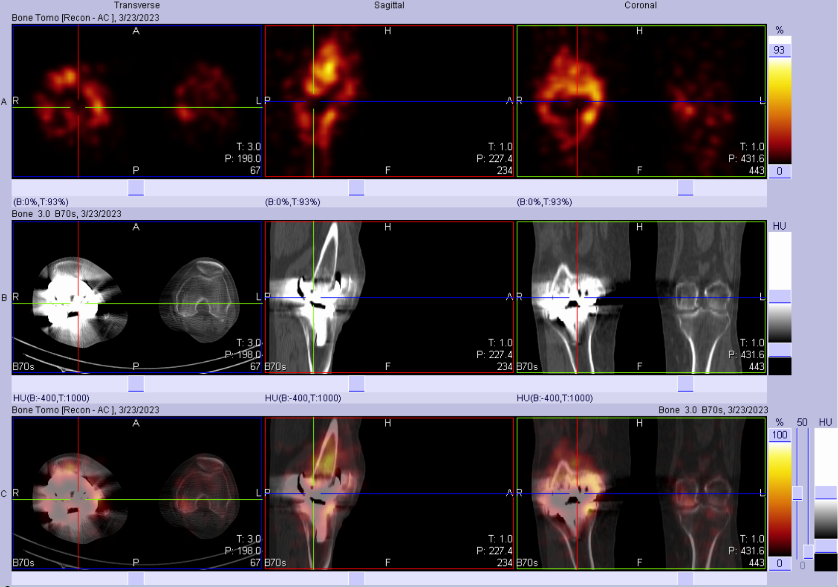 三相骨显像结果提示:右膝关节置换术后,三相骨显像血流相、血池相及延迟相阳性,结合影像特征考虑假体松动合并感染。