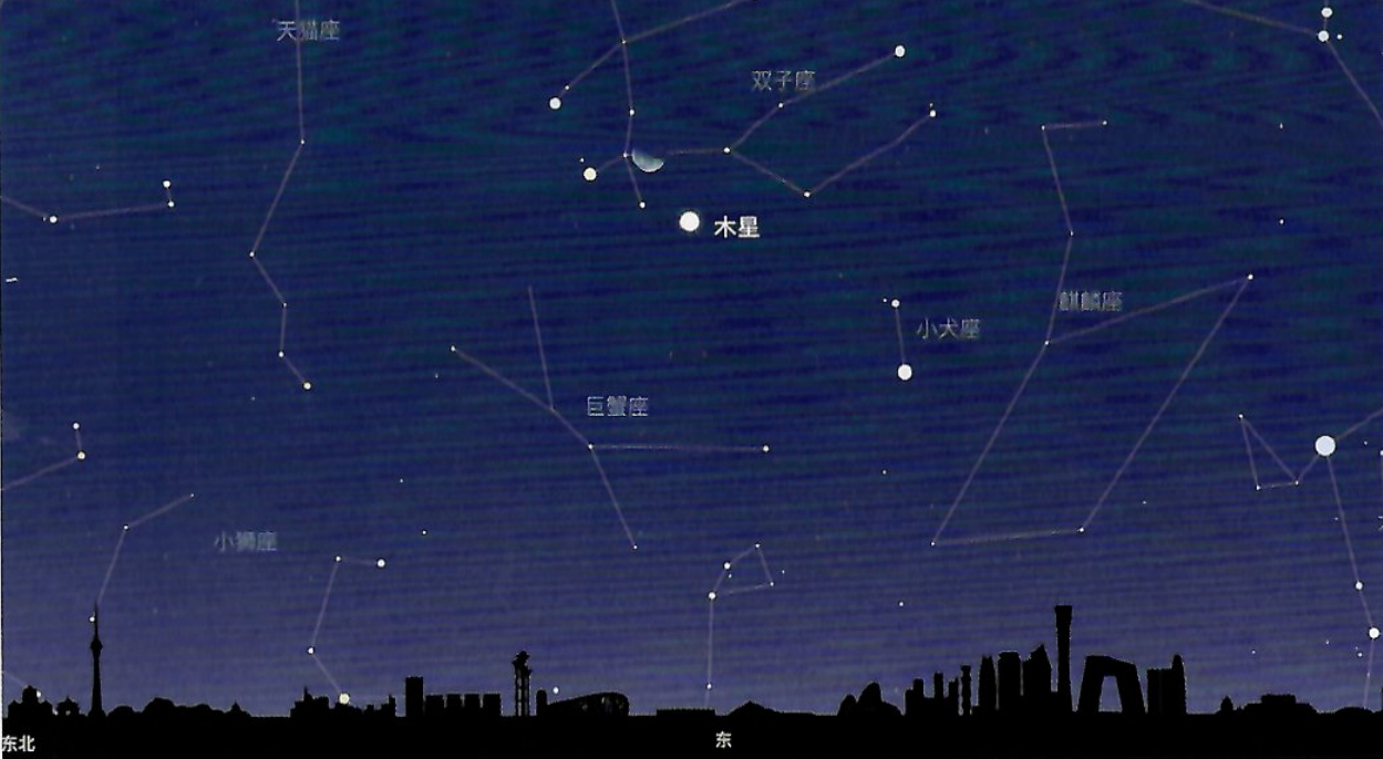 木星:在双子座。约于夜晚22时50分从东方升起,亮度约-2.2等,后半夜是观测它的好时机。