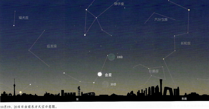 此前一日,19日的凌晨,月亮距离金星9°,月亮距离太阳更远,因此也更容易拍摄,因此10月19日凌晨也可以观测金星伴月。