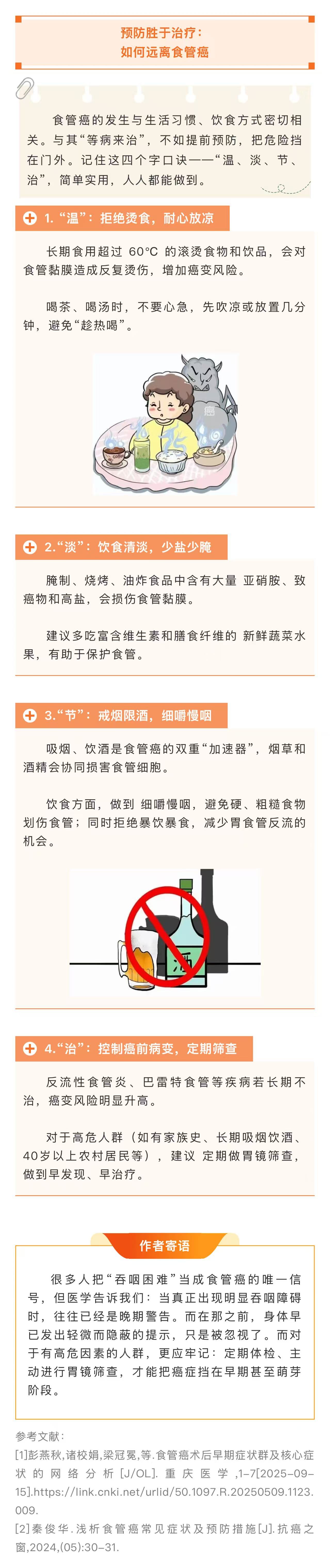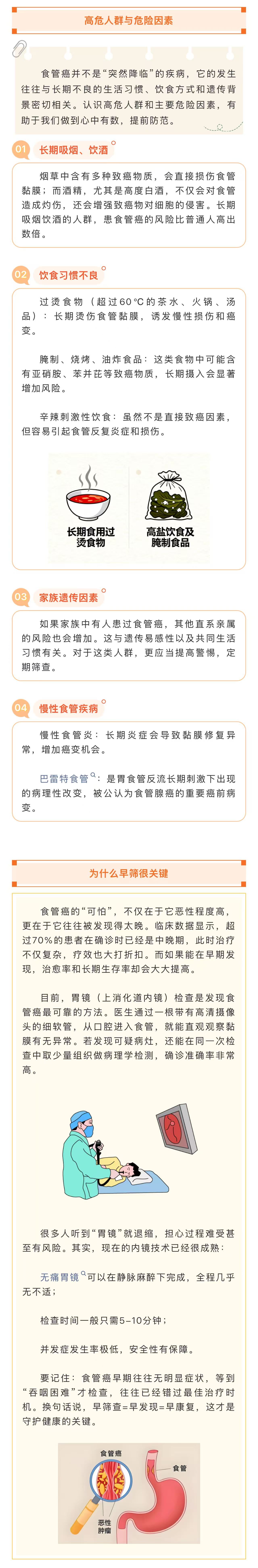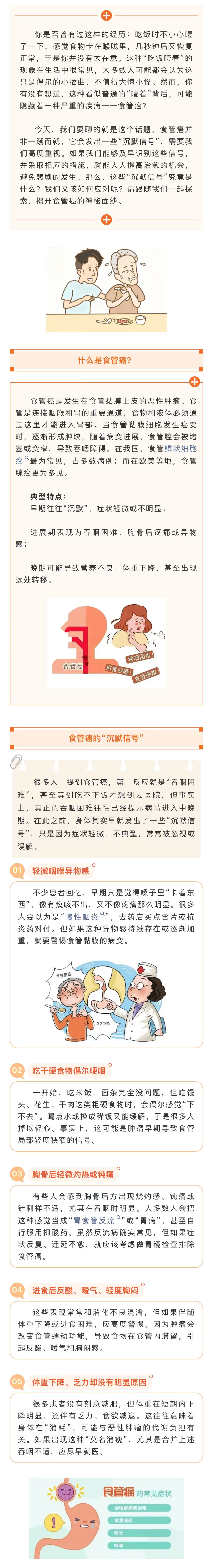 图文简介: 食管癌并非一蹴而就,它会发出一些“沉默信号”,需要我们高度重视。如果我们能够及早识别这些信号,并采取相应的措施,就能大大提高治愈的机会,避免悲剧的发生。
