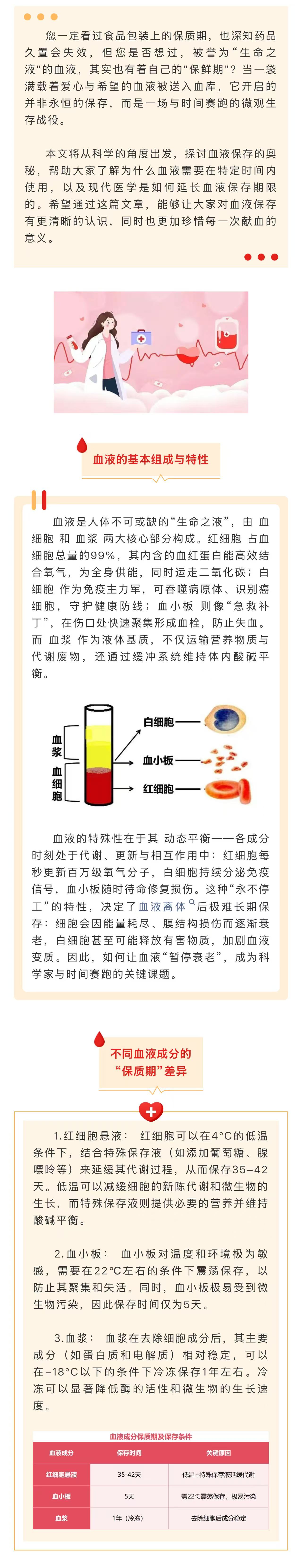图文简介: 本文将从科学的角度出发,探讨血液保存的奥秘,帮助大家了解为什么血液需要在特定时间内使用,以及现代医学是如何延长血液保存期限的。能够让大家对血液保存有更清晰的认识,同时也更加珍惜每一次献血的意义。