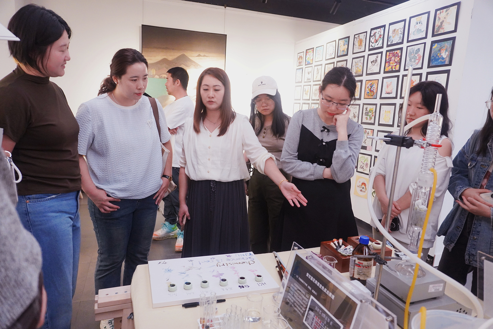 此外,展览中还设有化学专家现场互动环节,天津师范大学化学学院高级实验师,化学科普基地负责人刘忠义老师与天津师范大学化学学院讲师王娅妮博士,在现场向大家展示了制作颜料的相关过程。两位老师现场用索氏提取器从植物中提取有机颜料,并通过柱色谱法对其分离与纯化,向观众展示了中国绘画色彩的科学内涵,凸显了绘画与化学之间的跨学科互动。