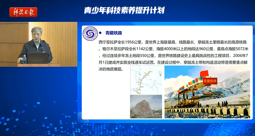 刘院士介绍了多项依赖地球科学支撑的超级工程:塔克拉玛干沙漠公路是世界最长的流动沙漠公路,全长552千米,其中流动沙漠段446千米,地质学家攻克了沙丘移动等难题;青藏铁路全长1956千米,其中960千米位于海拔4000米以上,最高点5072米,还途经550千米的多年冻土地段,建设者攻克了冻土带与构造活动带难题;三峡工程是世界最大的水电站,装机容量2240万千瓦,工程地质与地质灾害问题受到重视。此外,西气东输、南水北调等工程也凝聚着地球科学工作者的智慧。刘院士以自身60年科研经历强调自然科学研究需要勇于实践。他分享了丰富的野外考察经历,足迹遍布长白山、巴丹吉林沙漠、南极、北冰洋等国内外多地,还考察过40多个国家的特殊地质区域。同时,他提醒野外考察时需重视安全,要以科学为指导充分准备,不可盲目行动。