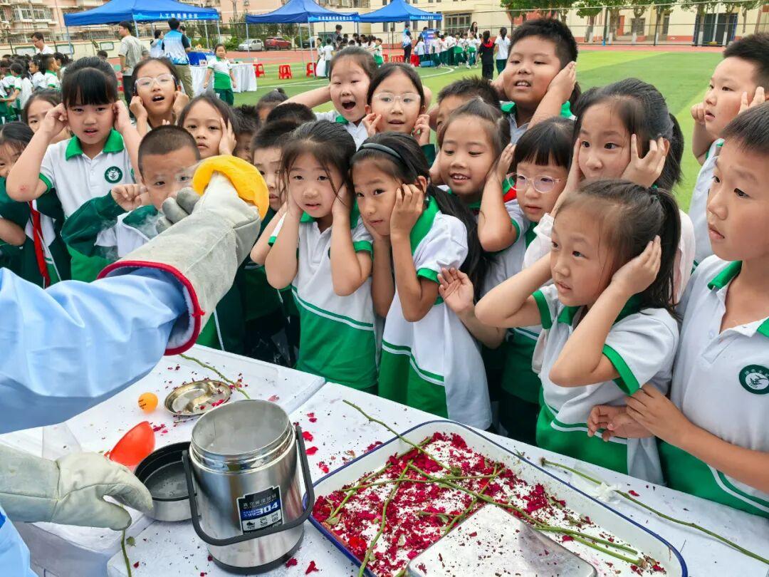 志愿者们借助腾腾雾气的液氮,将娇嫩的玫瑰花变得像玻璃一样脆,展示了气球体积收缩膨胀等现象,深入浅出地为孩子们讲解冻干原理和热胀冷缩的道理。