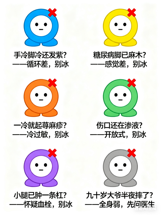 特别提醒:对于深静脉血栓高风险或已确诊血栓的患者,冰敷下肢关节时需格外谨慎并严格遵医嘱,避免不当操作影响循环评估。