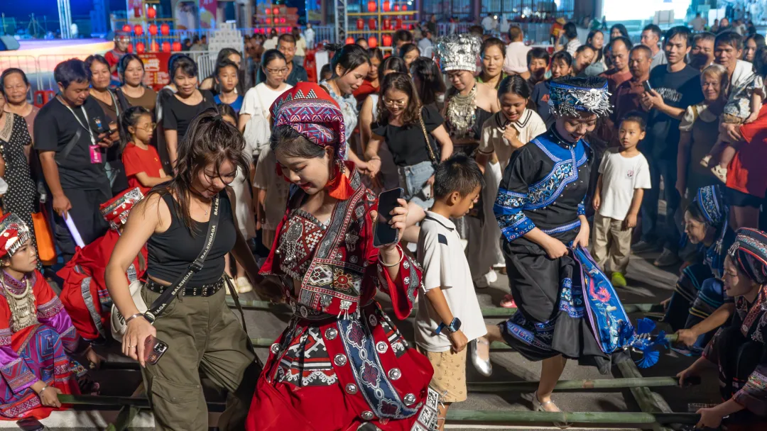 互动环节中,身着民族服饰的工作人员引导游客体验竹竿舞,非遗“高山流水”敬酒仪式也成为游客拍照记录的亮点。结合民俗知识的问答活动,让游客在参与中更深入理解本地文化,获得的银票可兑换非遗蜡染、主题灯笼等纪念品,增强了活动的趣味性与体验感。