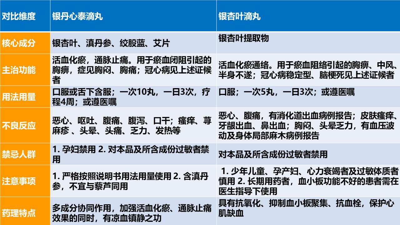图文简介: 银丹心泰滴丸与银杏叶滴丸是治疗心脑血管相关的常用药,在功效主治上都具有活血化瘀的作用,但在成分、适用症、用药安全等方面差异显著。