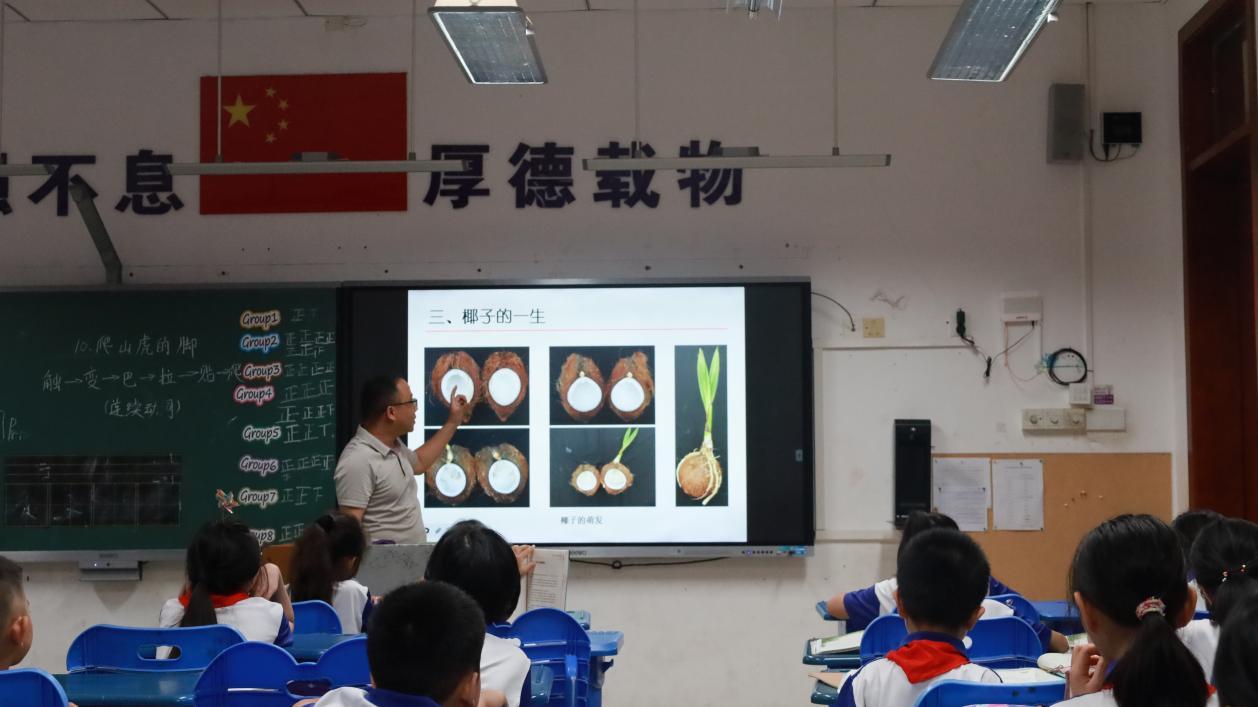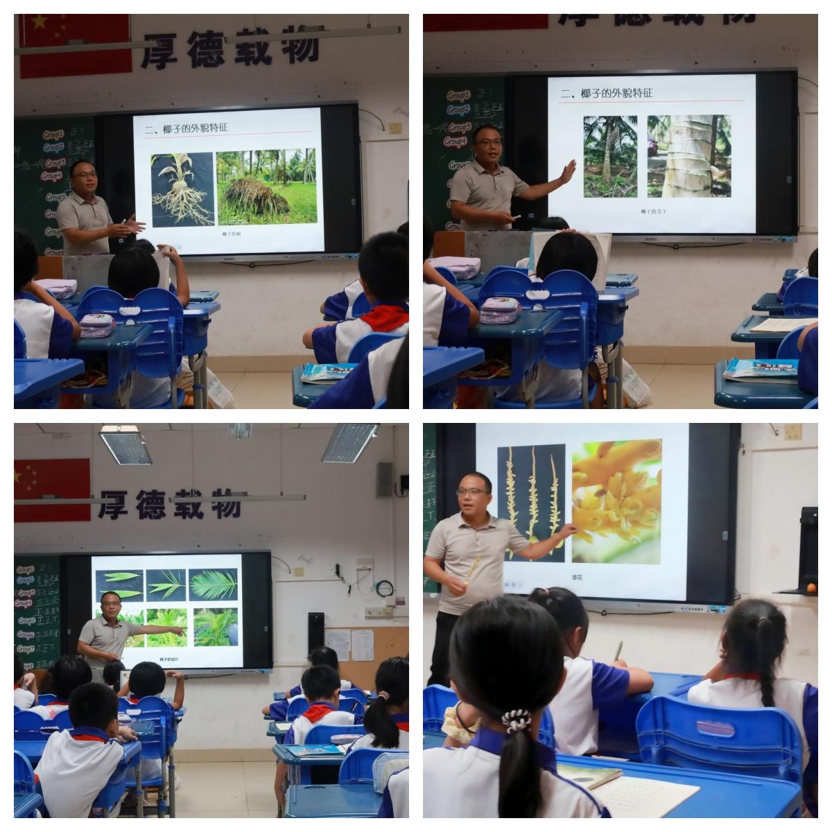 张老师还介绍了椰子从发芽、生长、结果到再次发芽的生命循环,引导同学们体会生命的可贵与韧性,树立敬畏自然的信念。当他讲到“海南椰子半中国,文昌椰子半海南”时,孩子们眼中闪烁着对家乡资源的热爱与自豪。