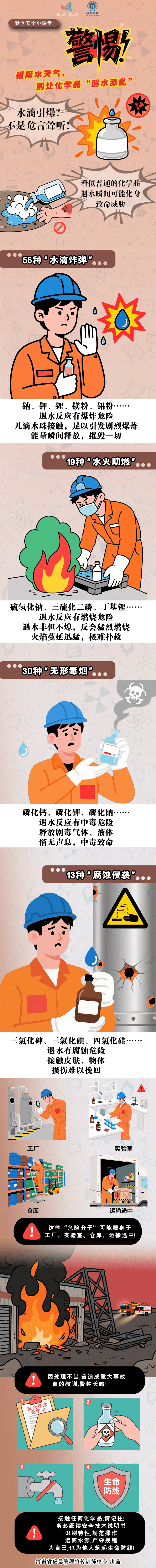 图文简介: 部分化学品遇水后可能发生剧烈化学反应,潜藏极大安全风险。为帮助大家精准识别风险、掌握科学应对方法,本期“秋季安全小课堂”详细解读各类化学品遇水反应特性,提醒涉及化学品生产、储存、运输和使用的单位及个人
