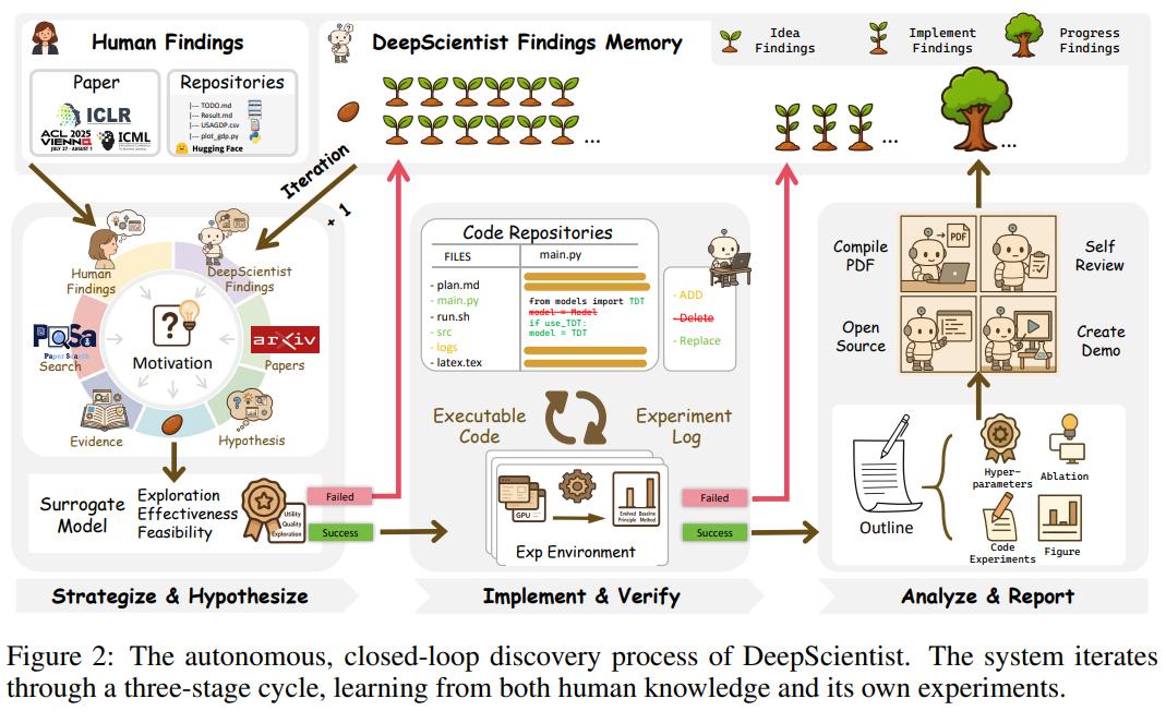 其次,它的认知迭代靠实验,而不是靠相信。DeepScientist从不相信任何一个想法,无论这个想法听起来多么天才。它信奉的是科学实证主义:可重复的实验结果高于一切权威和推理。