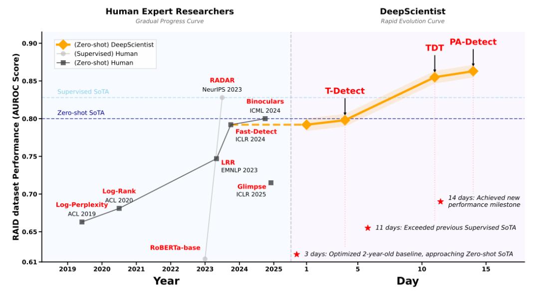 DeepScientist 用 2 周即可达到人类 3 年才能达到的水平 图源:论文[1]